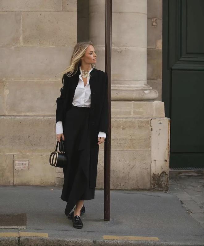 搭配一件白色真丝半裙让层次更清晰,也凸显身体比例,一双黑色乐福鞋的搭配,展现随性之美