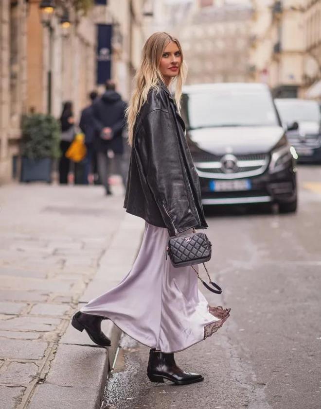 黑色真皮西装外套,成为衣橱中不可替代的主角,内搭一件紫色真丝连衣裙,赋予穿着者一种无需刻意雕琢的高级感,