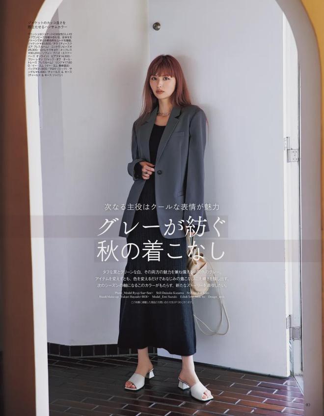 灰色西装外套,因为松弛有度,很好地划分黄金比例显高又显瘦,很适合东方女人的气质。