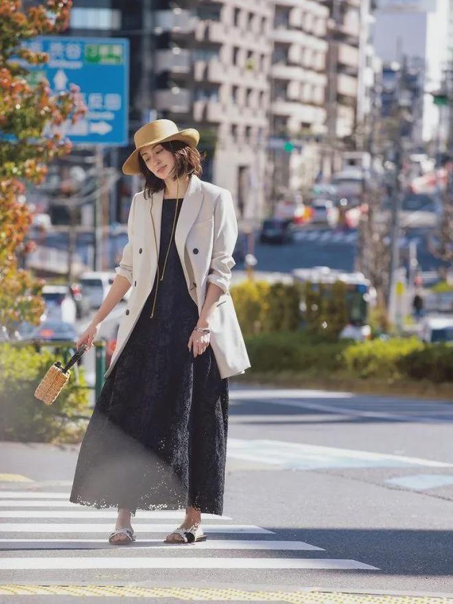 内搭一件黑色针织连衣裙,营造东方女人低调内敛的气质,时髦而不突兀,简单穿就很好看。