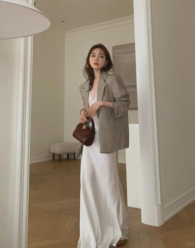 内搭一件白色v领连衣裙,彰显精致韵味,轻松打造出知性优雅的底蕴与从容自若的气场