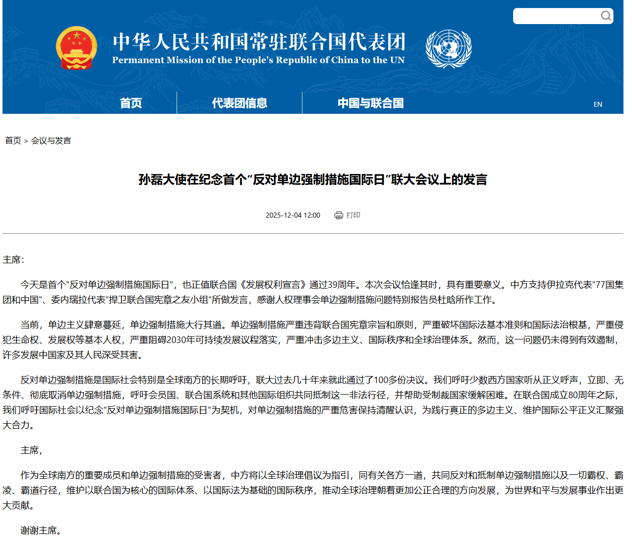中国常驻联合国代表团网站截图
