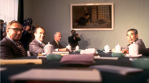 在上海工作一天后,周恩来、基辛格、尼克松、罗杰斯共同起草上海公报 资料图