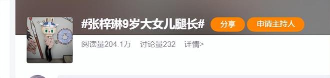 张梓琳晒照后,#张梓琳9岁女儿腿长#话题迅速冲上热搜。