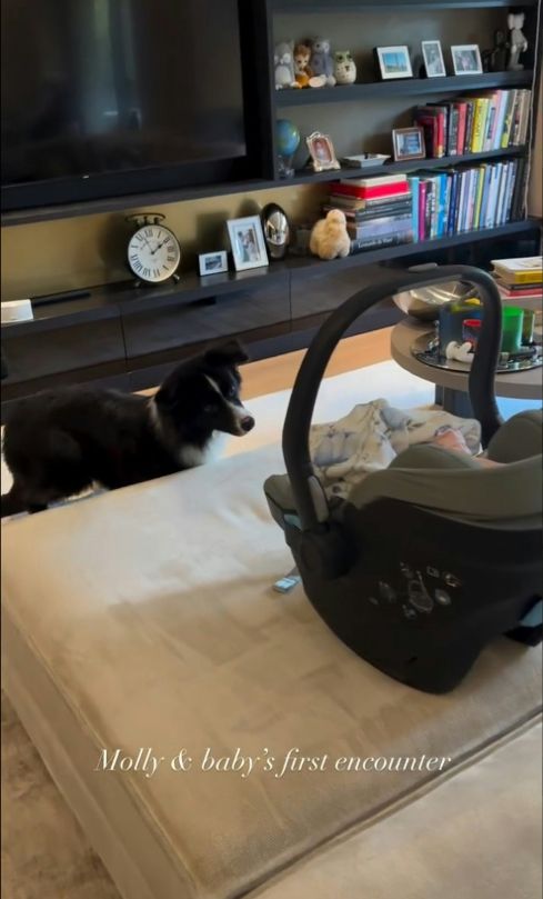 照片中小宝宝正在熟睡,十分可爱。丁子田也已经带女儿回到家中,她写道:“welcome homee.(欢迎回家)”。她还拍摄视频记录了爱犬Molly见到女儿的反应,Molly 围着沙发打量婴儿篮,不时侧头张望,似乎对这位家庭新成员充满好奇!