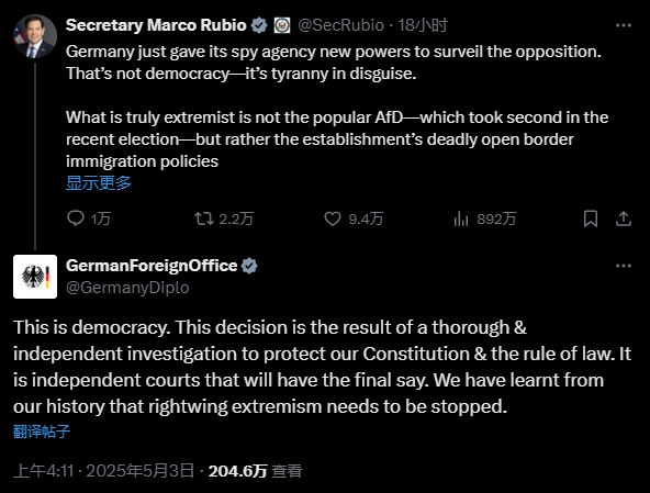 今年5月,就德国选择党被列为明确的“极右翼组织”,美国国务卿鲁比奥表示反对,与德国外交部在社交媒体上陷入“口水战”