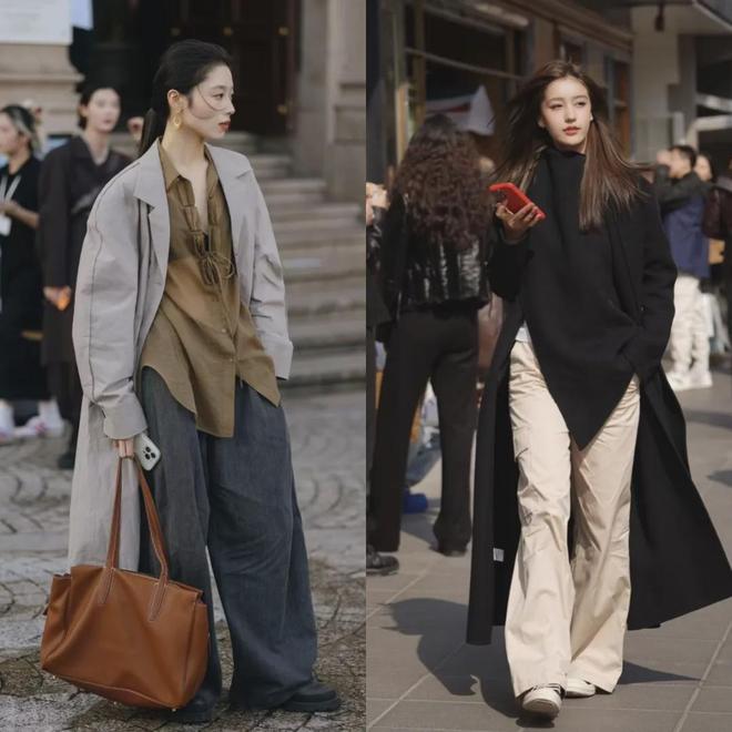 上海、杭州街拍中的“大衣+裤子”的穿搭中,高腰阔腿裤的出镜率是最高的,而且这些小姐姐穿的阔腿裤垂感还特别好,和大衣的线条衔接得特别好,完全不会显得臃肿。