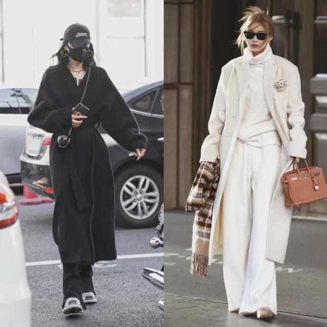 在大衣的颜色选择上,她们更喜欢一些简单的颜色,比如黑、白、灰、驼色,这些颜色非常地百搭,而且搭配出来的效果非常干净高级。