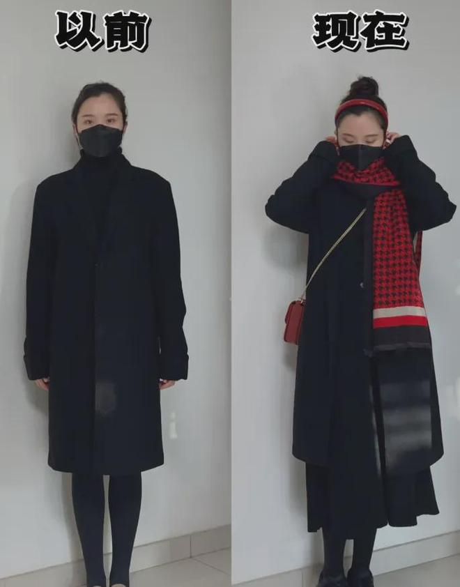 或者我们也可以通过配饰来打造明暗对比的效果,你看上图的这位姐妹之前她穿的是一身黑,看上去毫无亮点。