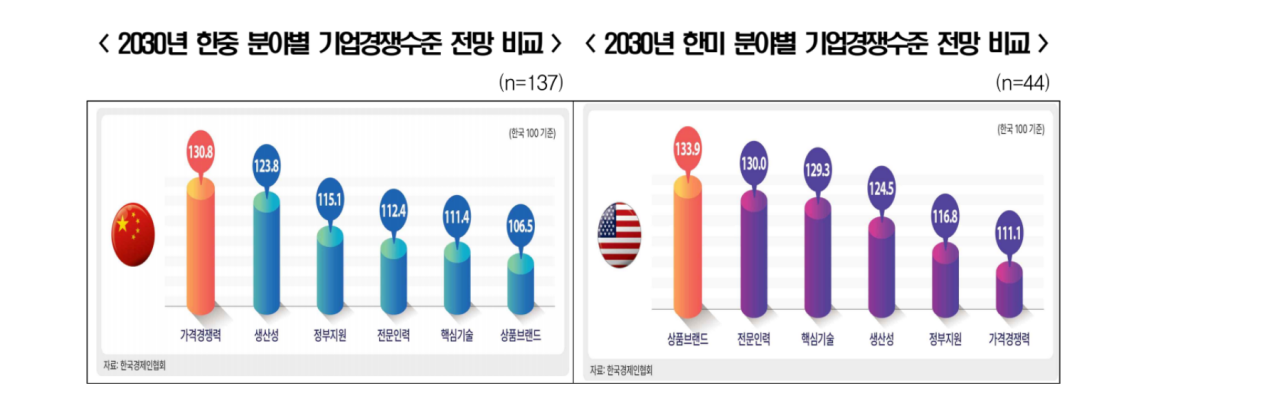 具体看调查结果的话,被问及当前最大的竞争对手时,62.5%的韩企回答是“中国”,数量远超回答美国(22.5%)和日本(9.5%)的企业。如果将时间设定为2030年,回答“中国”的韩企比例还进一步提升到了68.5%。这其实意味着多数韩企认为,现有的世界产业格局不会发生大的变化,美国和日本曾经的技术优势,将会一直缓慢流失。