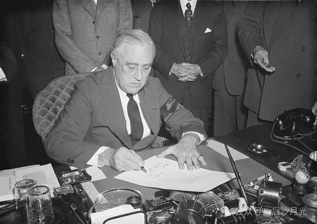 1941年12月8日,罗斯福签署对日宣战书,他的左臂上缠着黑纱。同时,国会确定12月7日为美国“国耻日”。