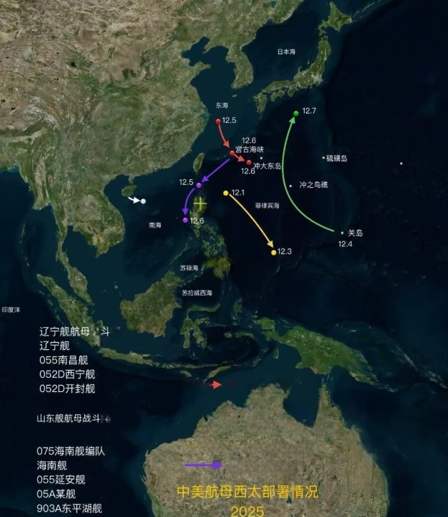 西太平洋的航母玩家,主要是中国和美国。中国海军辽宁舰编队,在12月6日东出宫古海峡后,就调转方向、一路向北,穿越奄美大岛和大东群岛之间的海域,12月7日在距离喜界岛不到200海里的区域活动。目前还没有辽宁舰的最新位置,不过外界予以了高度关注,因为这个航向着实罕见,很可能会出现在日本本土附近海域,不排除会进出一些敏感的海峡,比如大隅海峡,甚至可能环绕日本一周,进行武力展示。
