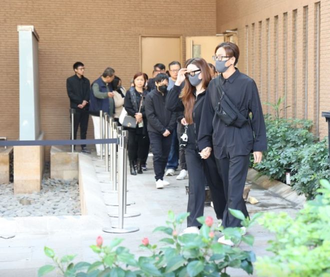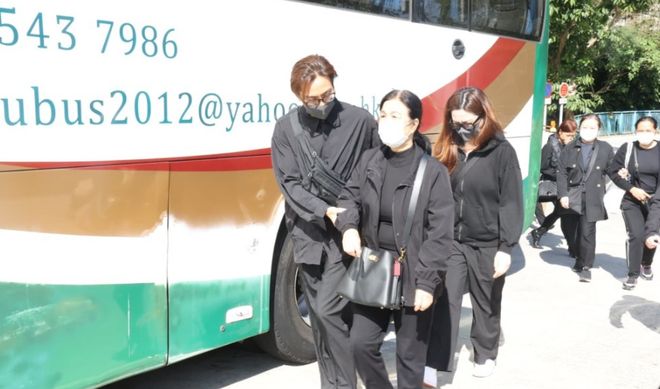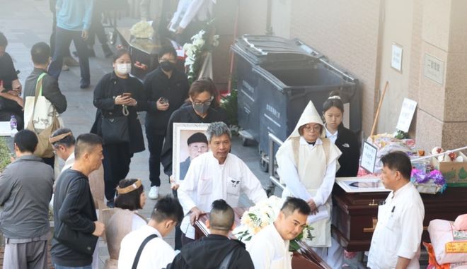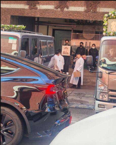 马国明身穿黑色素服,一脸哀伤捧着父亲遗照登上灵车。太太汤洛雯同样身穿全黑服饰、戴着粗框眼镜,陪同婆婆及其他亲友乘坐巴士,汤洛雯细心搀扶婆婆下车,一行人走到大堂入口与马国明会合,一同进场。