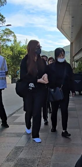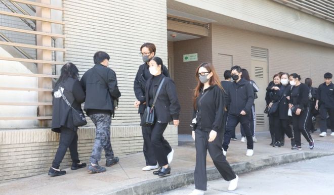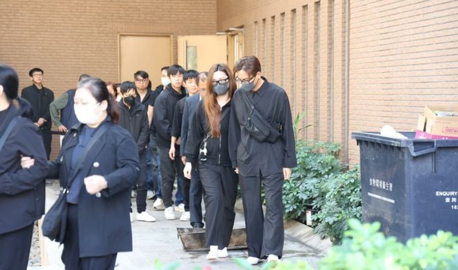 火化仪式结束后,葬礼堂的工作人员带领约30 位亲友跨过火盆,马国明神情哀伤的牵着妻子离开,两人跨过火盆后,又一左一右搀扶马国明母亲上车,期间汤洛雯向记者合十致意。