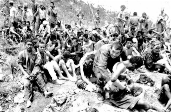 日本投降后,冲绳岛上的难民。冲绳战役期间,大量冲绳本地居民被日军裹挟,编入战争体系,该役非正常死亡的冲绳人中,除了死于炮火和疾病、饥饿,还有很多居民死于日军强制“集体自决”