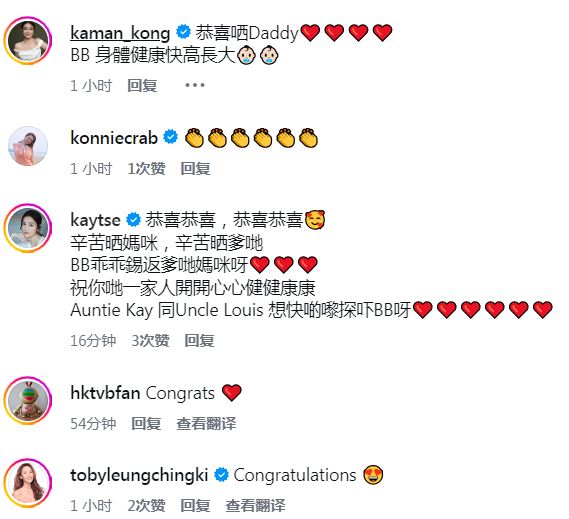 喜讯发出后,江嘉敏、谢安琪、胡定欣、王君馨、林夏薇、容祖儿等女艺人纷纷留言祝福!