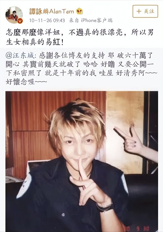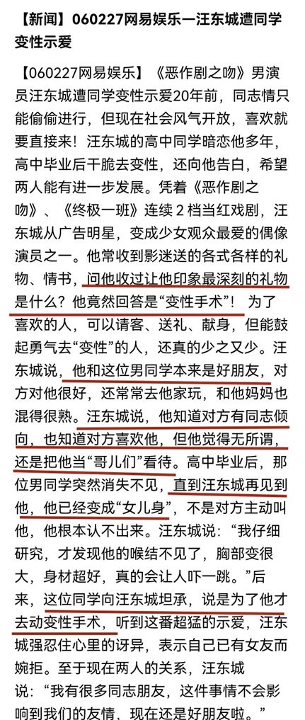 早在学生时代,汪东城就已经成了同性目光的焦点。有个男同学早就对他心生好感,频频示好,汪东城还当人家是好兄弟。直到高中毕业后再见面,才发现昔日哥们竟为了向他表白,远赴泰兰德变性,就为了向他告白。看得出来心意足够了,但是汪东城无福消受,只能婉拒了。