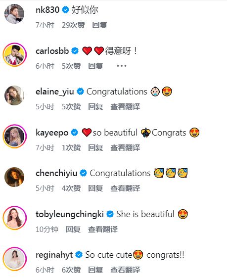 陈敏之、岑丽香、袁伟豪、陈自瑶、姚子羚等艺人纷纷留言恭喜!周励淇则表示:好像你!