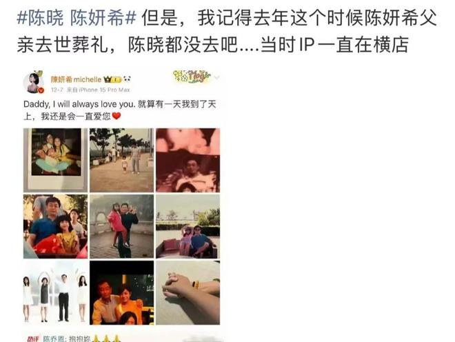 陈妍希父亲十年前称赞陈晓的事突然被翻了出来,而且营销号密集发通稿中,说当年陈妍希与陈晓官宣恋情后,其父对这段感情十分支持,私下里不仅认真回复粉丝私信,明确表示会将陈晓当作自己半个儿子对待,还特意拿出自己珍藏多年的皮衣、围巾赠予陈晓。反正话里话外就一个意思,当初陈妍希父亲很看重陈晓这个女婿。