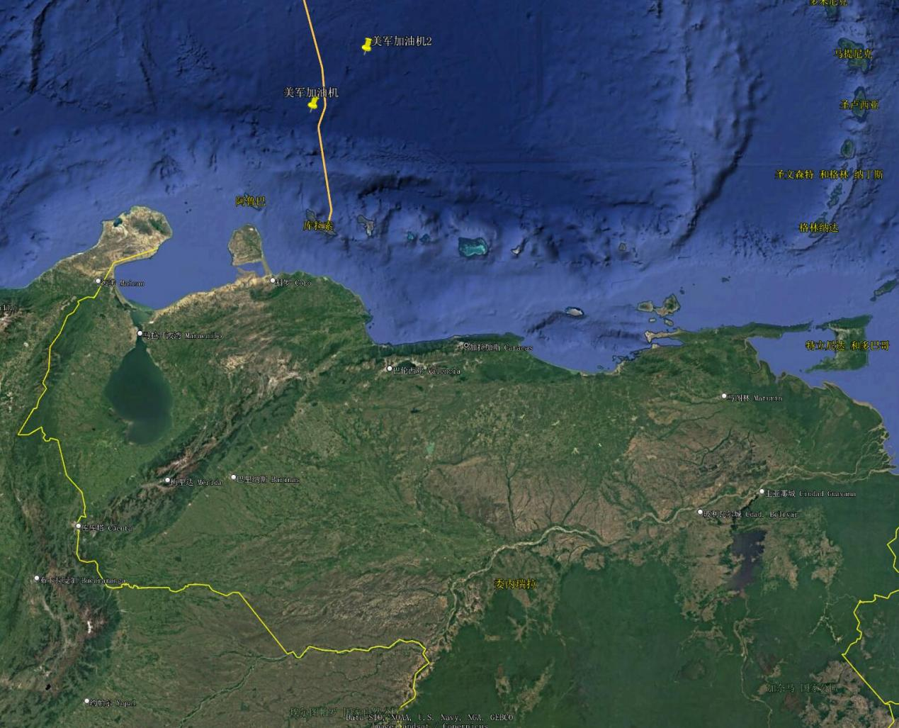 民航机遭遇美军加油机的位置就在委内瑞拉北面海域