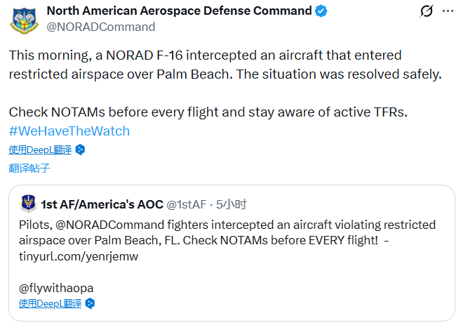 北美防空司令部在帖文中表示:“今天上午,一架北美防空司令部的F-16战斗机在棕榈滩上空拦截了一架闯入限制空域的飞机。事件已安全解决。”北美防空司令部与美国空军相关账号没有透露有关该飞机的更多信息,但在贴文中提示飞行员们查阅航行通告并确认飞行限制区信息。