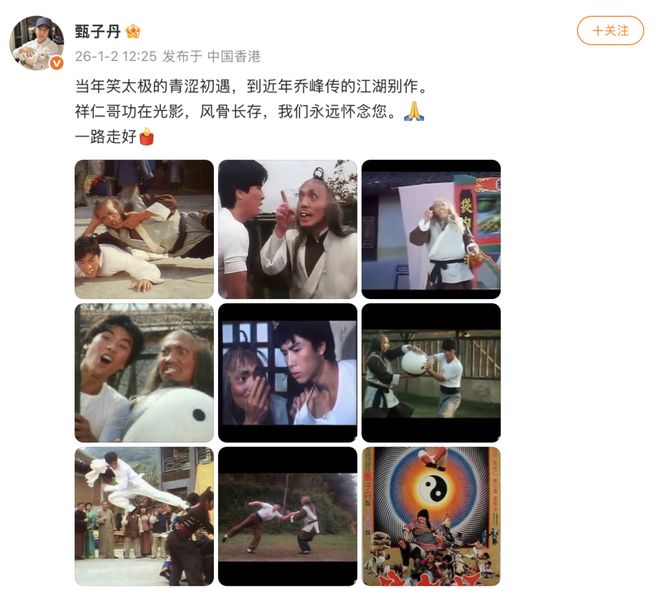 甄子丹 发文悼念:当年笑太极的青涩初遇,到近年乔峰传的江湖别作。祥仁哥功在光影,风骨长存,我们永远怀念您。一路走好。