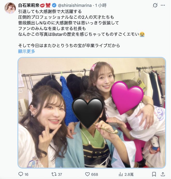 看到白石妈妈这张照片,你有没有觉得奇怪、为什么要把那两位女优的脸遮起来? 这是经纪公司BStar大感谢祭的后台,在这个秀肌肉的场合照理来说大家都盛装出席、想尽办法争奇斗艳才是,所以白石妈妈把人家的脸遮起来的动作真的非常奇怪,是什么原因让这两个女孩不能露脸? 答案是,她们引退了。 也就是说她们有来到后台为大家加油、说不定有上台表演,只是因为引退了所以不能露脸;那这两位女优是谁呢?重点应该是右边那一...