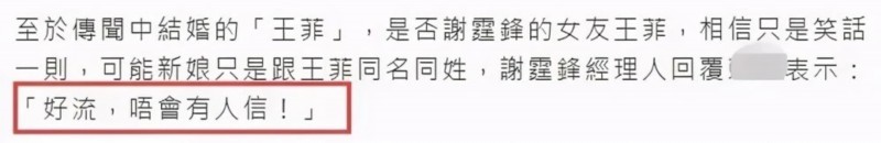 当时,港媒找谢霆锋的经纪人回应此事,对方一口咬定是假新闻,外界认为,谢霆锋经纪人能够极速为王菲辟谣,这一点就证明了“锋菲”关系不变。