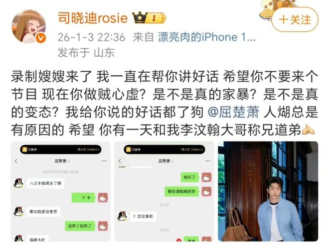 本以为这就是屈楚萧的全部瓜料,没想到司晓迪再开新帖,直接甩出更炸裂的猛料,控诉屈楚萧不仅抠门还对她家暴,她直言屈楚萧曾动手殴打自己闺蜜的闺蜜。