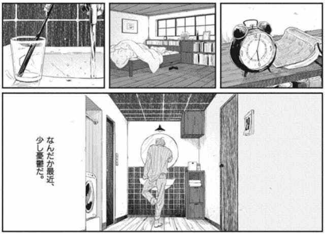 故事的开始,是一连串生活的静物描绘。远离尘嚣的独栋住宅、闹钟、早晨起床后的床铺、牙刷与水龙头,然后是主角野末的内心旁白:「总觉得最近有点忧郁。」只用一页的篇幅,点破社会人士企图保持从容优雅,却难掩在规律生活下的些许拘谨与无奈。