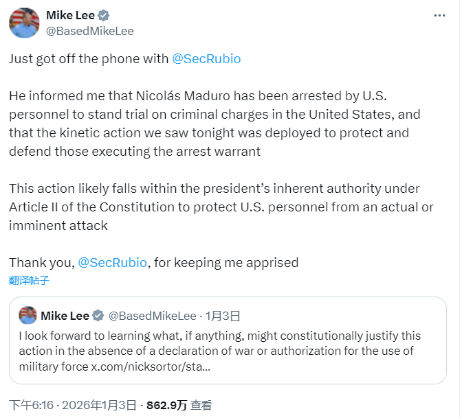 同日,美国犹他州共和党联邦参议员迈克·李在社媒X发文称,马杜罗将“在美国就刑事指控接受审判”(stand trial)。