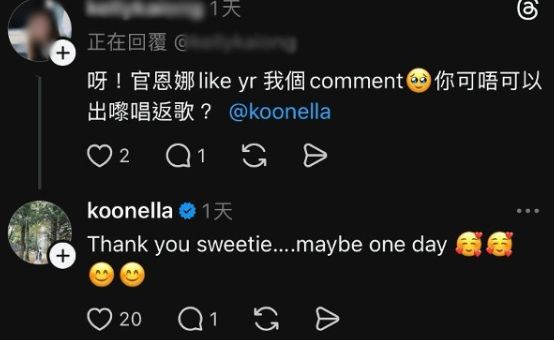 之后,又有网友提到《谢谢你离开》这首歌也很好听,这条评论也得到了 Ella 的点赞,网友们兴奋留言:“啊!官恩娜点赞我的评论了,你能不能出来再唱唱歌呀?” Ella暖心回复:“Thank you sweetie...maybe one day”。