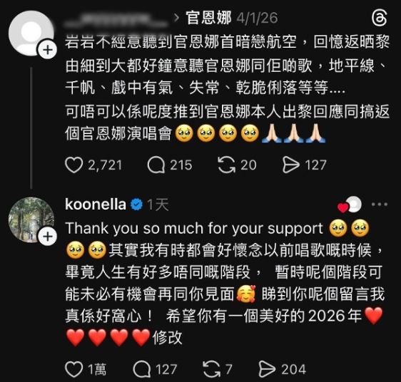 这条帖子发布后,收获了超2000点赞和200多条留言,不少网友纷纷称赞 Ella唱歌好听,没想到得到了官恩娜亲自回复:“Thank you so much for your support,其实我有时候也会很怀念以前唱歌的日子,毕竟人生有很多不同的阶段,现阶段暂时可能没办法和大家见面,看到你的这条留言我真的很暖心!希望你有一个美好的 2026 年。”