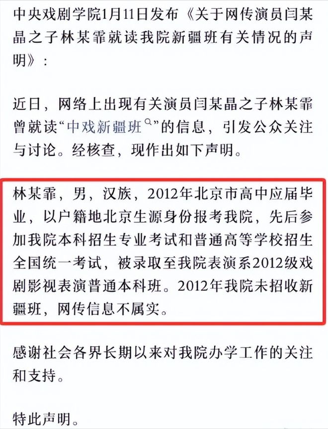 中戏显然不想被扯上关系,迅速发表声明,称林傲霏是以北京生源身份考入普通本科班,2012年并未招收新疆班,网传信息不实。但这一回应并未平息质疑,有网友发现中戏近期深陷违规招生传闻,内部大佬接连塌房,加上学校未公示当年录取名单,林傲霏本人也未正面回应定向服务义务等核心问题,所谓辟谣也只有学校的一面之词,没有实质性的证据,很难让人相信。
