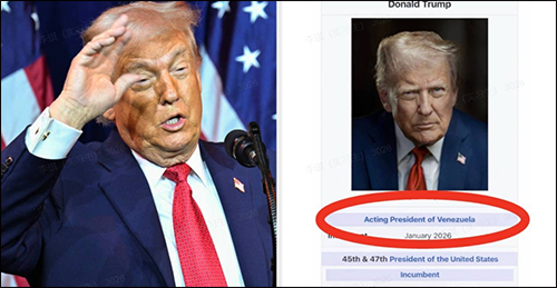 当地时间1月11日,美国总统特朗普在"真实社交"平台上发布了一张效仿维基百科页面的图片,图片中将他标注为“委内瑞拉代理总统”。