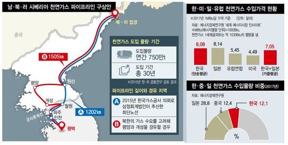 韩朝俄西伯利亚天然气管道构想案(左) 美日韩欧天然气进口价格现状(右上) 中日韩天然气进口量比重(2017)(右下)韩民族日报