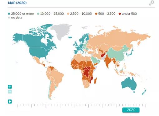 有趣的是,尽管发达国家人均及格线一般是两万美元,但是从地图上一看,2020年人均一万美元以上的冷色土地面积基本是发达国家+中国为主,