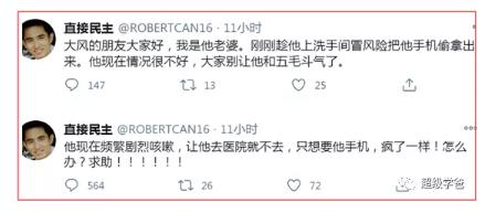 扛到了今天,确诊整一周的时候,他老婆抢过他的手机,发了几则推特。说他现在情况很不好,频繁剧烈咳嗽,但就是不肯去医院。