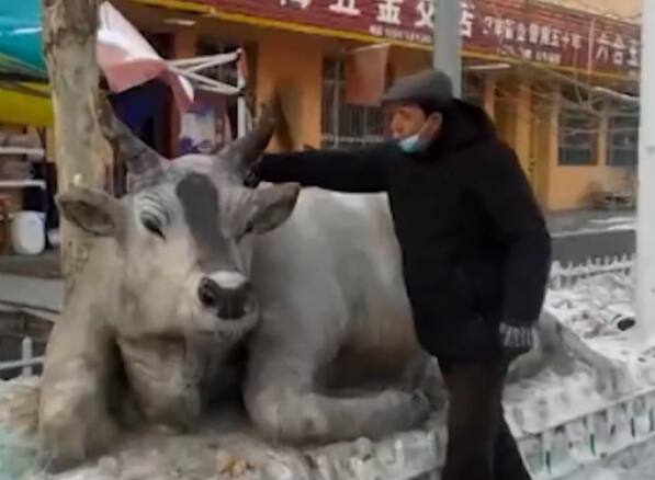 1月4日,新疆伊犁一位大叔用雪堆了一头栩栩如生的牛,为了让整头牛看起来十分的逼真,大叔还用煤渣调整雪的颜色。