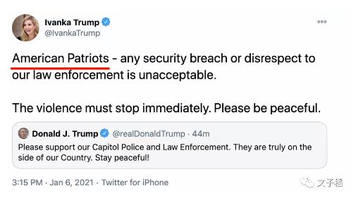 恰恰是美国在世界各地祸害一方的手段,教育了美国国内自己的民众。民众用美国教给他们搞乱别国的手段反过来占领了美国国会。这位名叫阿什莉·巴比特的美国空军退役女兵。不仅曾在美国空军服役14年,还高达4次赴海外执行任务。这样的人,按照美国的标准,绝对是不折不扣的爱国者!因为,她作为勤王军的先锋,用美军培训的技能率先爬上了国会大厦的窗户。很不幸,迎接她的不是掌声,而是国会警卫的一颗子弹。但是,正是她的带领,后续的勤王军才一个接一个的攻占了国会大厦。1月6号之前,内心矛盾的懂王就像少女怀春一样,既怕川粉不来,又怕川粉乱来。果然,川粉不负众望,为了支持懂王连任,直接攻陷了国会大厦。他既不希望勤王军使用暴力,又想借助勤王军声势为自己争取谈判筹码。民主党的众议院议长佩洛西,这个懂王的老对头,直接称勤王军为“暴徒”。虽然,只有自己的女儿兼白宫高级顾问的伊万卡称勤王军为“美国爱国者”(American Patriots)!被推特禁言12小时之后,大总统川普发布第一条视频。同时称新政府将在1月20日就职,现在将专注于有序、顺利的政权过渡,需要的是“治愈和和解”。在视频中,懂王竟然谴责那些闯入国会大厦的“勤王军”是“玷污了美国民主”,违法者必将付出代价。没错,那些响应懂王号召,为懂王连任总统冲锋陷阵的勤王军正在变成懂王口中的“违法者”!