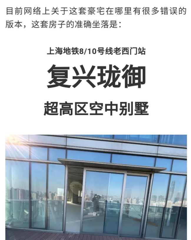 就在10日晚,有网友发帖爆料称,他在一个购房公众号上看到了郑爽房子的信息,是上海复兴珑御空中别墅,毛坯房的市场售价就高达1.5亿。