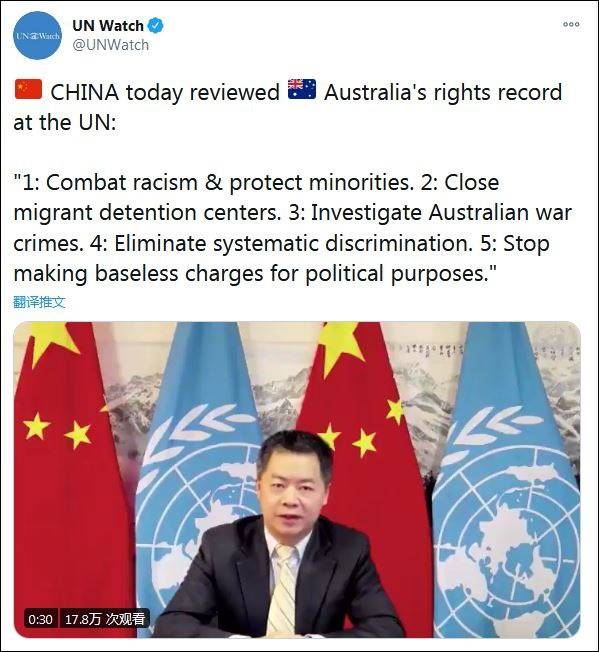联合国观察组织录下的中国代表发言,对澳大利亚人权问题提出5项要求推特图