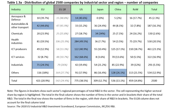 我们看看还能不能从这个报告中挖掘出一些有用的信息,注意数据的样本只是这2500家大企业。看下中美欧日各自的优势和弱点是什么,各国都在对哪些产业重点的投入。