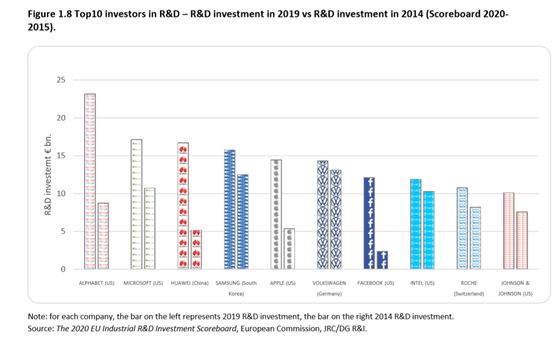 2019年的全球研发投入前十位的公司排名是Alphabet(谷歌的母公司),微软,华为,三星,苹果,大众,脸书,英特尔,罗氏(医药),强生。