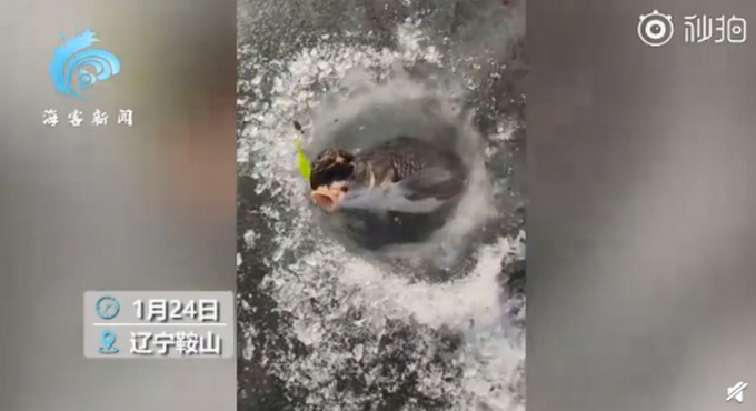 1月24日,辽宁鞍山钓友在冰钓时钓上一条鲤鱼。令人称奇的是,一只蛤蟆附在了鲤鱼头上,死抠着鲤鱼眼珠不放。钓友们都懵了,随后开始兴奋解说,称之为“金蟾抱鲤”、“金蟾献礼(鲤)”。钓友表示,钓鱼十多年第一次遇到这种情况,拍照留念后就把鲤鱼和蛤蟆一起放生了。
