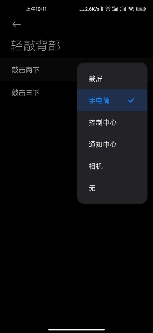 据张国全介绍,在小米10至尊纪念版的设置-更多设置-按键快捷方式-轻敲背部开启该功能,提供了“敲击两下”、“敲击三下”选项。