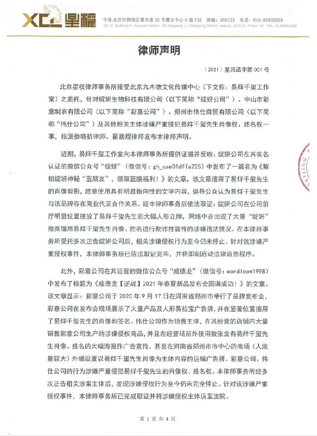这些行为严重侵犯了易烊千玺肖像权、姓名权,还误导公众认为易烊千玺先生与该品牌存在商业代言合作关系,侵犯广大消费者的知情权。