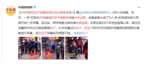 据@石家庄互联网举报中心 1月31日消息,近日,一则“石家庄市民经过肛拭子核酸检测后秒变企鹅,走路姿势变成了外八字”的视频在各大网络平台广泛传播。经证实,网传消息为移花接木式谣言,石家庄自2021年发生疫情以来,各社区采集标本均为口咽或鼻咽拭子,从未采集过肛拭子,肛拭子标本只对住院并发腹泻的新冠肺炎患者进行采集,且肛拭子采集后无明显不适。