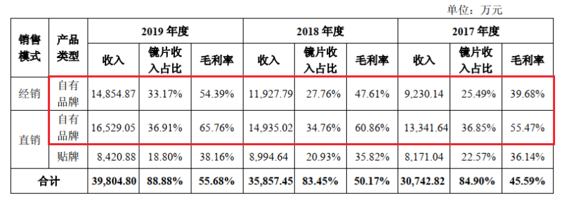 据招股书显示,明月镜片的自有品牌通过经销和直销两种渠道销售,2019年合计贡献70%以上的镜片收入,同时,直销自有品牌镜片毛利率高达65.76%,较代工品牌高出27.6%。