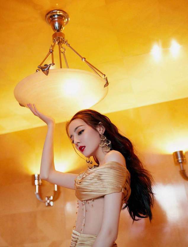 迪丽热巴一袭金色薄纱露腰鱼尾长裙,搭配黑色长卷发,温婉可人。